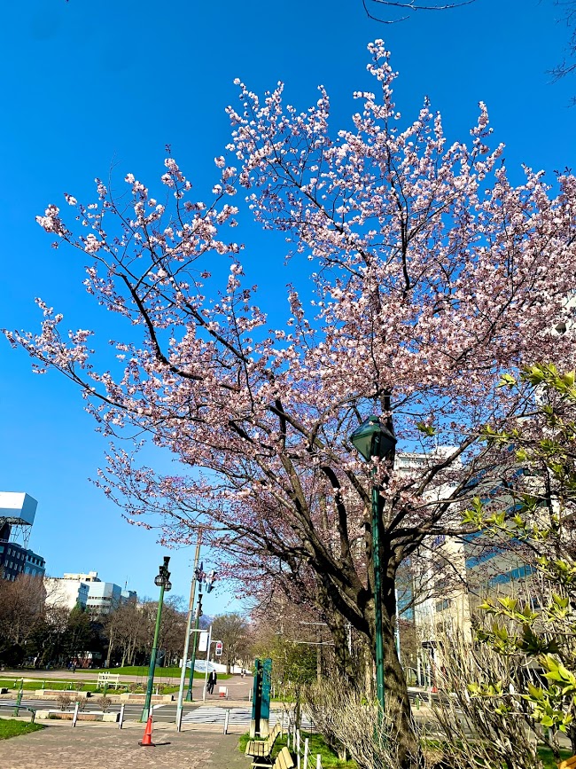札幌の朝だを。大通公園を散策。聞けば札幌でもようやく、桜が開花時期を迎えたらしい。まだ満開には程遠いが、開花したばかりの桜がこれ。きれいだよな。関東と比べると、おおむね1ヵ月遅れ位なんだろうな。札幌の朝の散策は、気温は寒めだが、風はさわやか。本州と北海道と気候の違いを感じるな。