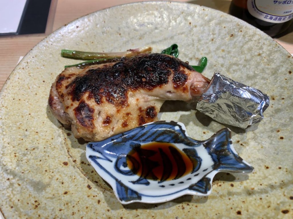 若鳥を塩麹で味付けした炉端焼き。本当は一匹、鶏の丸焼きを炉端焼きにするらしいんだが、大将曰く「一匹丸ごとは、一人ではとても食べきれません。モモだけにしておきましょう!」とのアドバイスあり、これに。うお・・・鶏肉は香ばしくジューシーに焼き上がってる!塩麴がそこになんとも良い塩梅で絡んで・・・最高に美味しな。