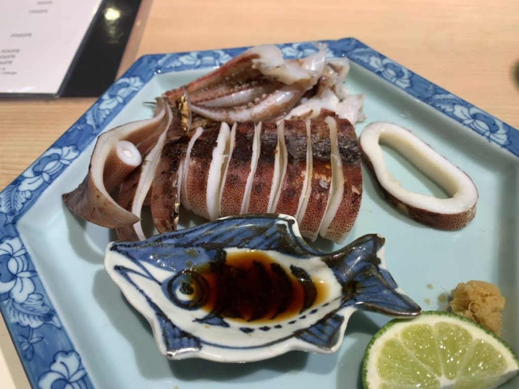 するめいかの炉端焼き。網走漁港に揚がったものと。美味しだが・・・炉端焼きのカウンター、一緒にいた、とってもハートが良く、仲睦まじい夫婦と仲良しに。話に気を取られ、出たて料理撮影を失念、少し食べた後での写真だが・・炉端焼き特有の香ばしさがいい感じ。美味しな。