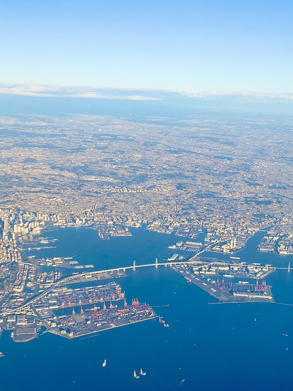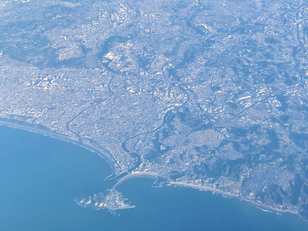 横浜のベイブリッジと江の島。今日は飛行機、低く飛んでくれてるな。嬉しい・・・