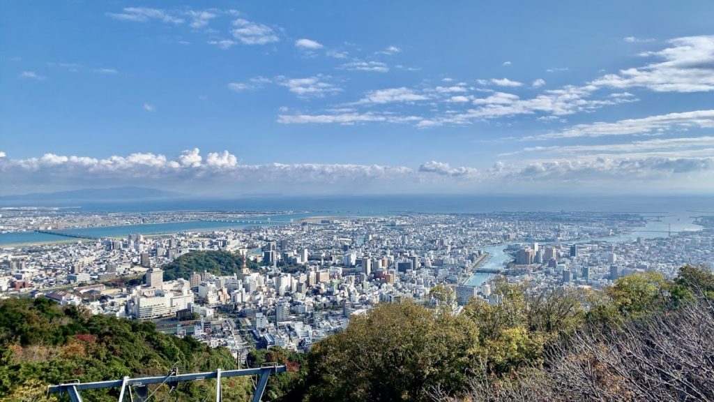 ロープウエイの終点、眉山(びざん)の山頂駅からの景色。最高だな。川が二本見える。左が吉野川、右が新町川。これは圧倒的。素晴らしい。きれいだよな。
