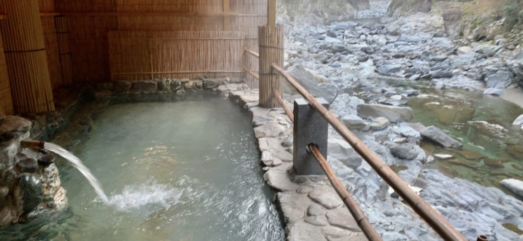 こちらは昨日のせせらぎの湯とは別、渓谷の湯。この朝湯はキモチよか。同じ湯のはずだが、光のかげんかな。こちらは白濁して見えるな。