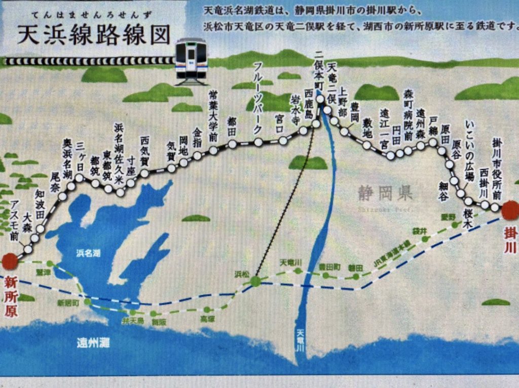 天竜浜名湖鉄道・天浜線のHPに掲載されている路線図。浜名湖の南側を走る東海道本線の浜松、舞阪、新所原、そして東端の掛川の位置関係、わかるだろうか?天浜線は、浜名湖の北側を走るのどかなローカル線なんだよな。