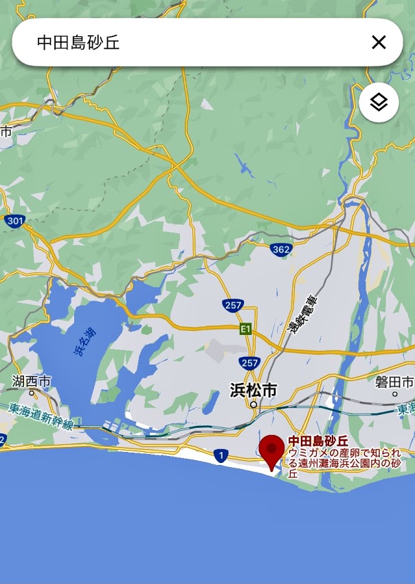 位置関係を。ここは遠州灘に面した、ウミガメが産卵をしに来る砂丘でもあるんだな。
