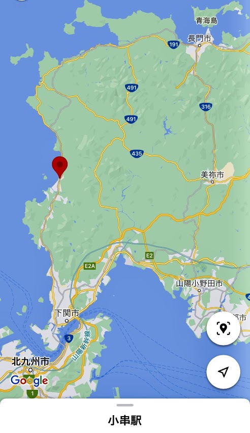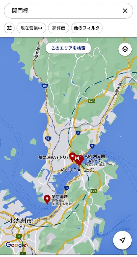 位置関係を。この地図で和布刈(めかり)公園とあるあたりが関門橋だよな。