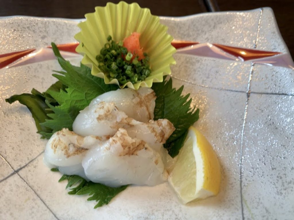 お造りと焼きふぐ。お造りは赤エビ、ひらまさ、マグロ、タイ、モンゴウイカ。それ萩本陣オリジナルの濃い口、刺身醤油で召し上がってねと。う~む。美味し。醤油もお造りに合うな。下は真ふくタタキ。山口県と言えばふぐ。それをすこし炙って出してくれた。やはりうましな。