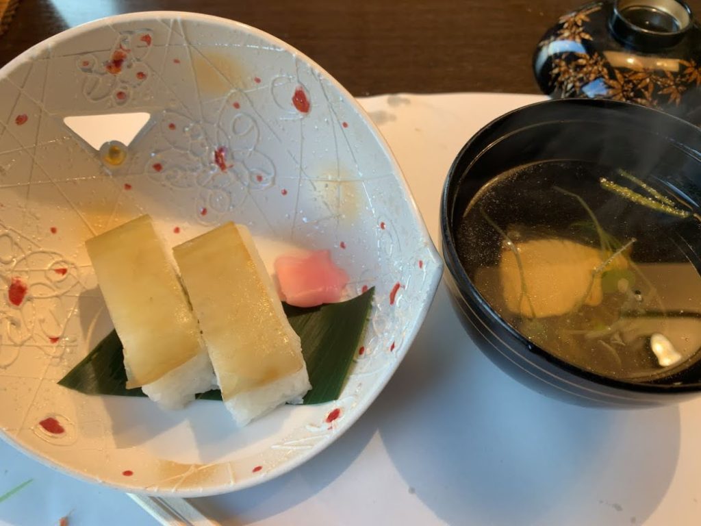 長州すし。鯛の昆布〆が乗っかってる。地魚清まし仕立ては、焼いた鰆(さわら)が入っていた。鰆の旨みが、強く感じられるな。