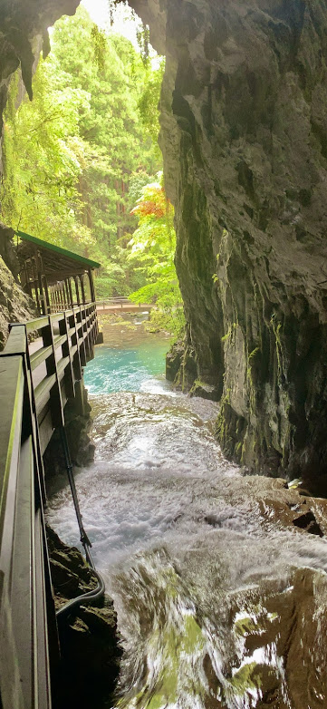 上の写真は、秋芳洞の入り口を外から撮った図。下の写真は、秋芳洞の中から外に向け撮った図。川の流れが結構ダイナミック。きれいだよな。