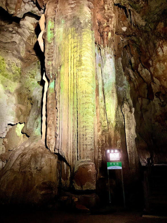 私が写真に撮った黄金柱はこれ。鍾乳洞の中、ひときわ凄いスケール感だったな。切手と比べてどうだろうか。