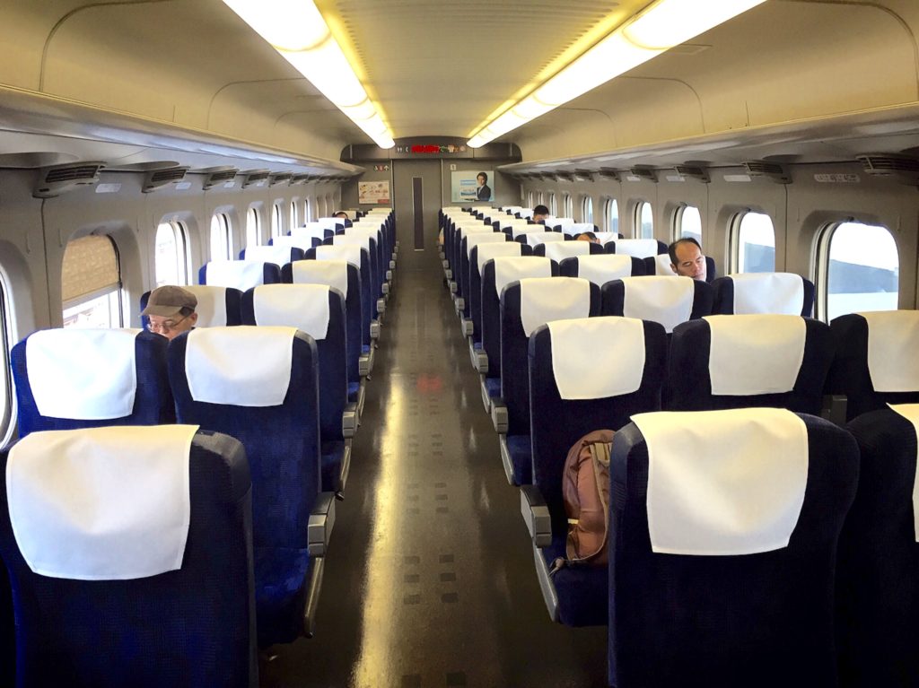 700系車両の室内。懐かしさが感じられる。シックな趣で、悪くないよな。ここは自由席だが・・平日の乗車率はご覧のとおり。う~む。高くはないよな。