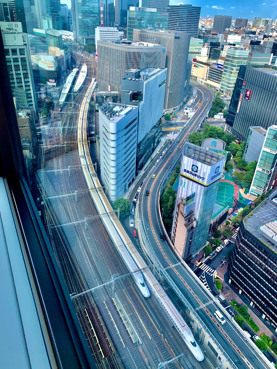 これは部屋から見える銀座・有楽町駅方向。驚いた・・・帝国ホテルのタワー館のこちらの真下は、テツが良く見えるんだな。この写真は東海道新幹線、上りと下りがすれ違っている図。ウナギが二匹、S字型に並んでいるみたいだ。それにしても・・・東海道本線、山手線、京浜東北線、東海道線、JR貨物・・・とにかく、ひっきりなしにJR、テツが動いていることに驚かさせるな。