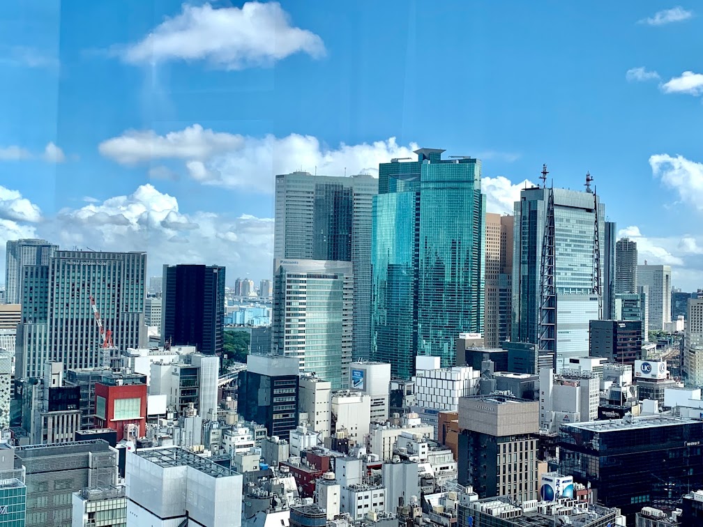 部屋からの汐留・銀座方向の景色。銀座の昭和の時代の眺めに対し、汐留の近代的なたたずまいが対照的。Panasonicビルの後ろに建っているのが電通ビル。そしてその電通ビルの左側には、ほんの少しだがレインボーブリッジ、そして東京湾が見えるな。