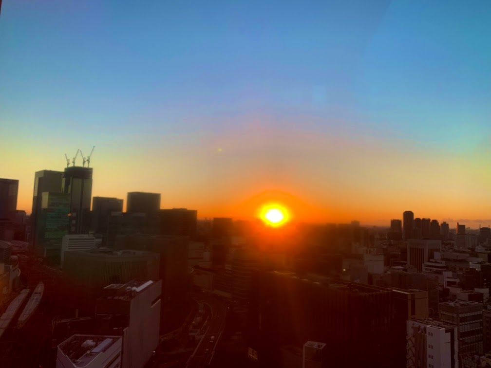 朝5時過ぎ。ホテルの部屋から汐留・銀座方向というより、上野の方かな。さらに北側を見ると、朝焼けが見えた。きれいだよな。カーテンを全開にしてしばらくすると、部屋の窓近くは朝日がものすごく入ってきて、ちょっと信じられないくらい明るくなる。これがきれいなんだよな。今回はここまでな。