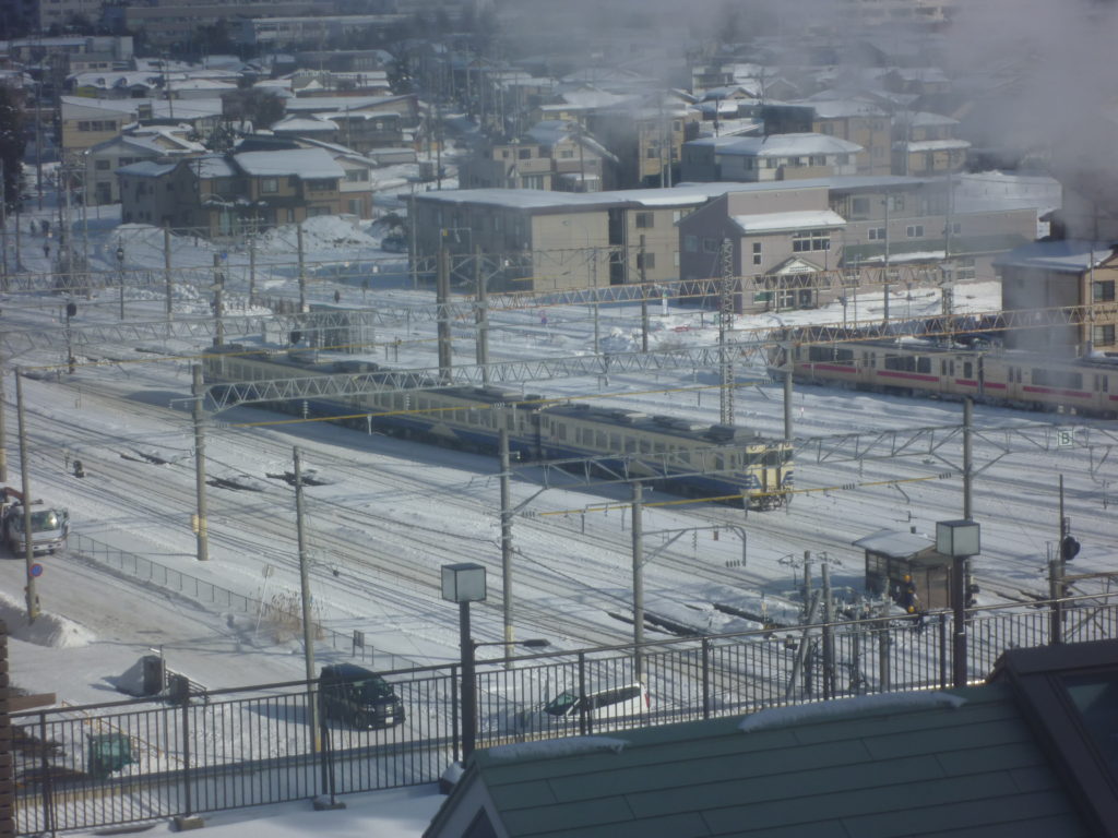 秋田の朝。曇り少し晴れ間・・・かな。このときの宿ホテルメトロポリタン秋田の部屋の窓から、秋田駅を臨む。手前車両は男鹿線、向こう車両は奥羽本線かな。