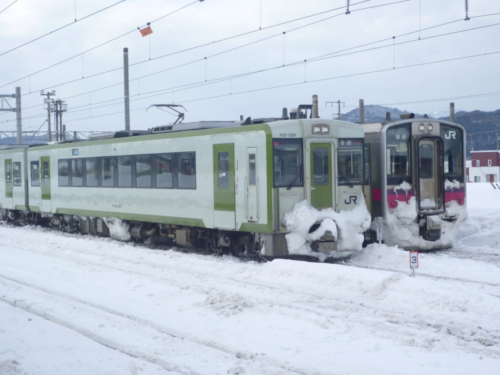 東能代駅。ここは、奥羽本線と花輪線が分岐する。手前の鶯色気動車車両は花輪線、向こうの赤ワイン色電車は奥羽本線だろうな。当方は花輪線で盛岡へ、そして山田線で宮古へ。