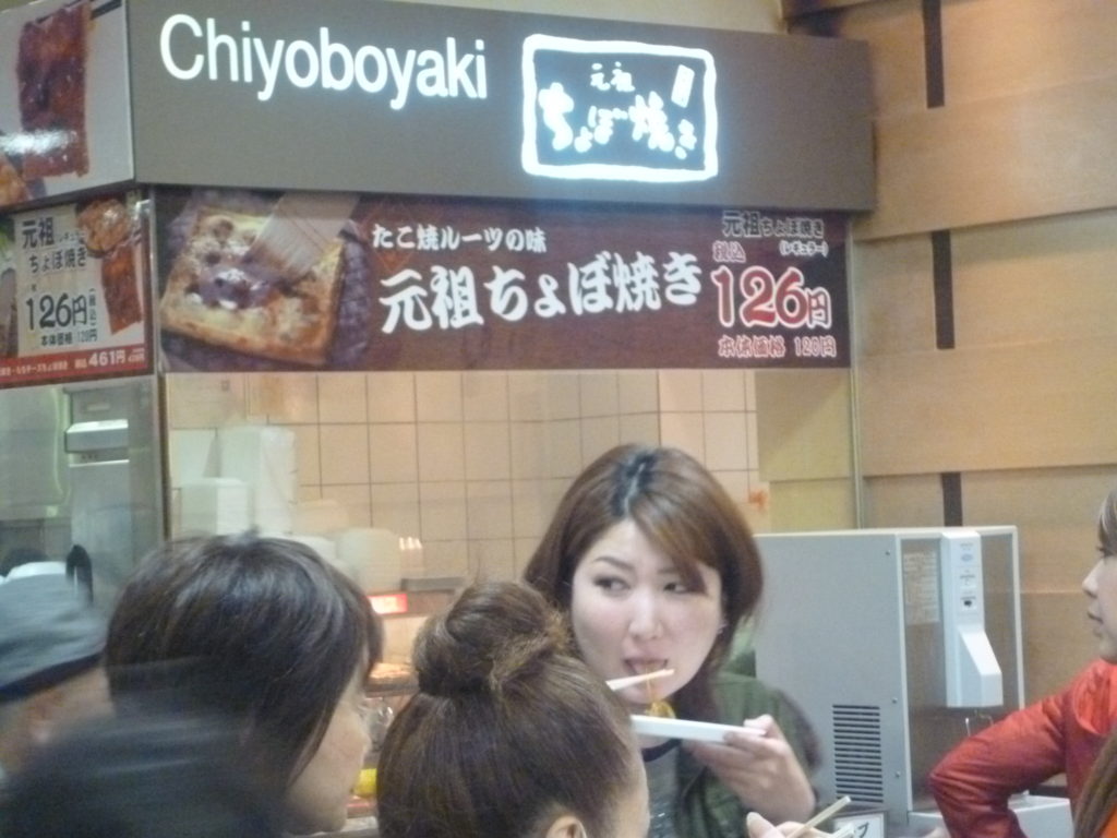 で、以前行ったときに気になった、ちょぼ焼きなる食べものを、調査(?)してきました。たこ焼きを平らにしたイメージかな。お好み焼きの味ではなく、たこ焼きの味ですね。1個126円。下記の写真はそれの2個分ですね。