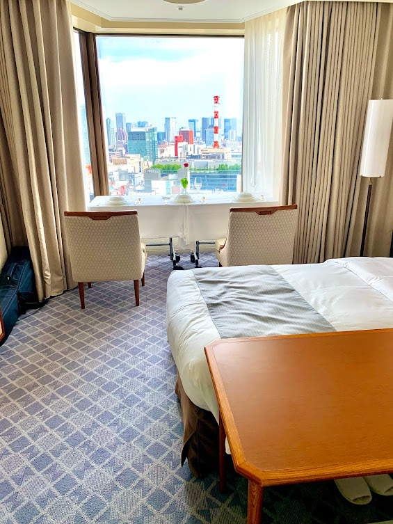 閑話休題。私が滞在している帝国ホテルのタワー館の特徴として、窓が大きな出窓になっていることがある。こうすることで、部屋の面積が大きく取れるし眺望が広がるし、部屋も明るくなる。良いことづくめだなと思った…この写真でいうと、白いクロスのテーブルがしつらえてあるあたりだよな。