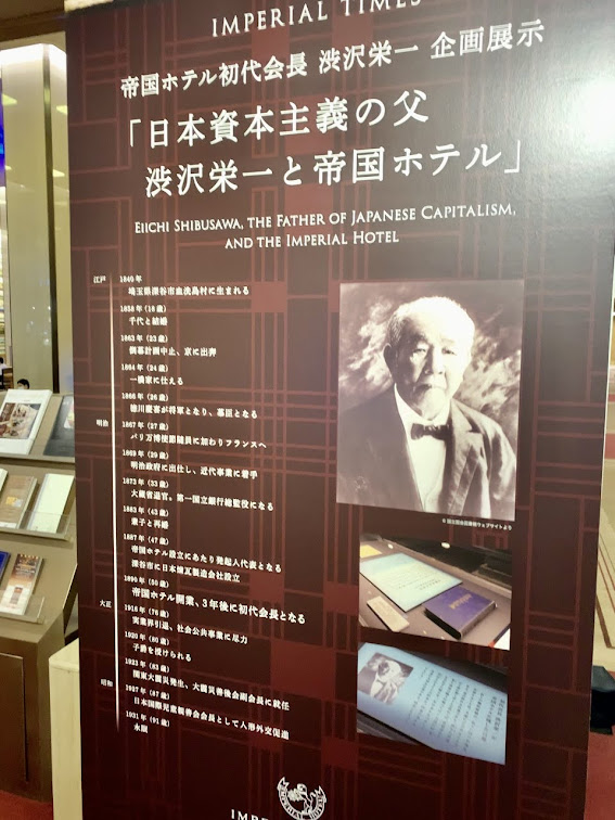 帝国ホテルを創業したのは、時の人、渋沢栄一なんだよな。本館ロビーを入ってすぐ左に「Imperial times」という展示コーナーがあって、俺が滞在中、ずっと彼の特集をやっていた。なんどか見させてもらった。この人の偉大さについては、人一倍、詳しくなったと思う。