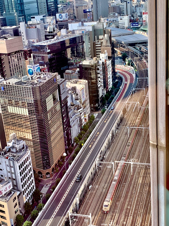 チェックアウト前、最後の最後。新橋方面を見ると、なんと東海道本線「サンライズ出雲・瀬戸」が迎えてくれた!おそらくは上り、東京着7時8分の車両が回送されてるんだと思う。嬉しかったな。