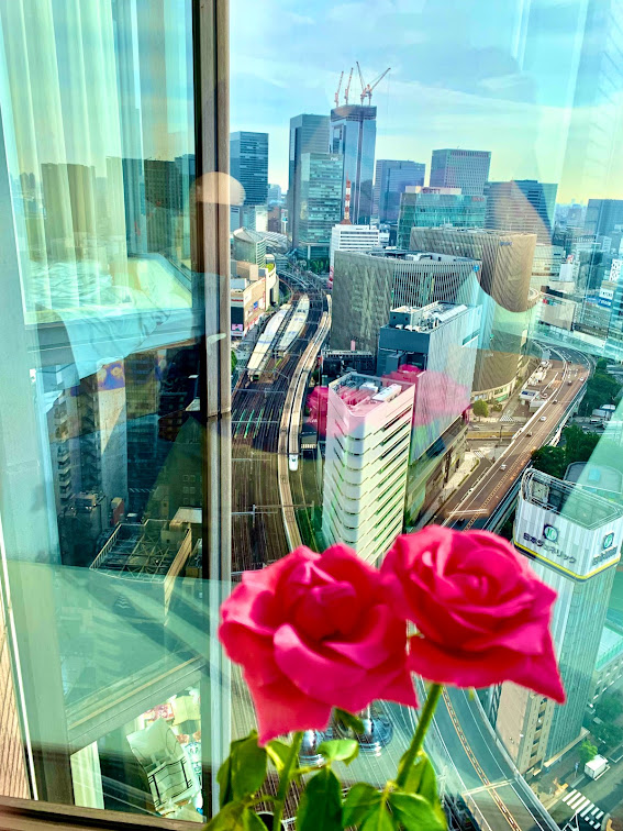 薔薇越しに有楽町方面の写真を。今日もまた東海道新幹線が、うなぎのように交差している。これを見るのも最後。寂しくなるな。