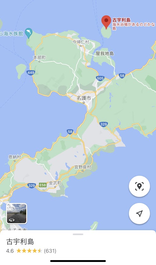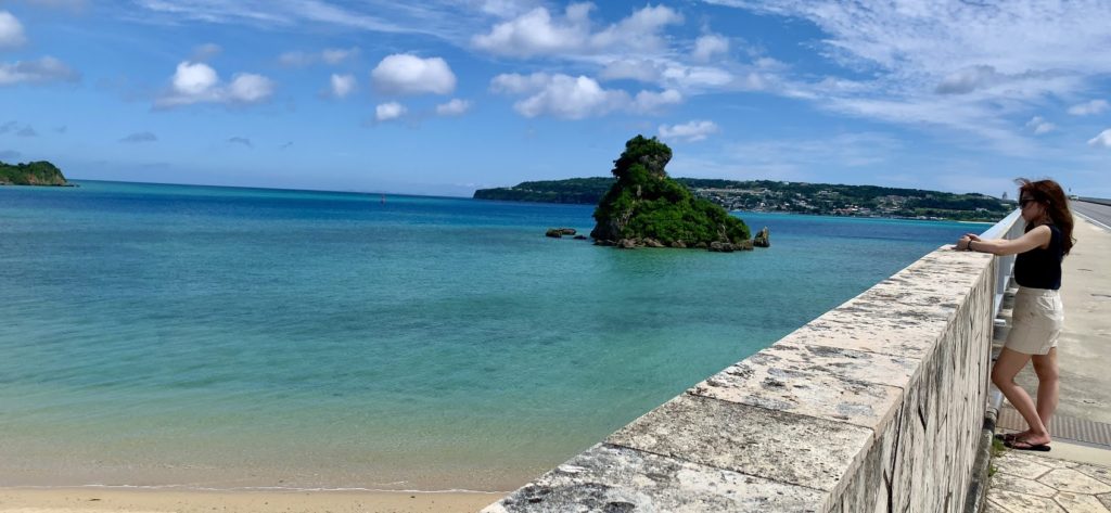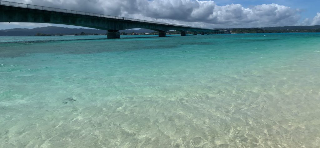 古宇利島大橋を渡り、逆を向いて来た方向の海を望む。海の色が濃い目の蒼からペパーミント・グリーンチックな色に変わる。日の当たり方が違うからかな。角度によって、微妙に異なって見えるよな。どの景色も綺麗。そして海の透明度が高い。素晴らしいな。