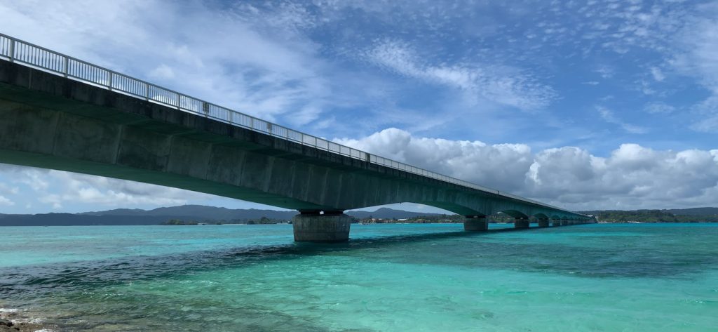 古宇利島大橋を渡る途中で、橋越しに海を望む。う~む。この海の蒼さと言ったら・・・きれいだよな。