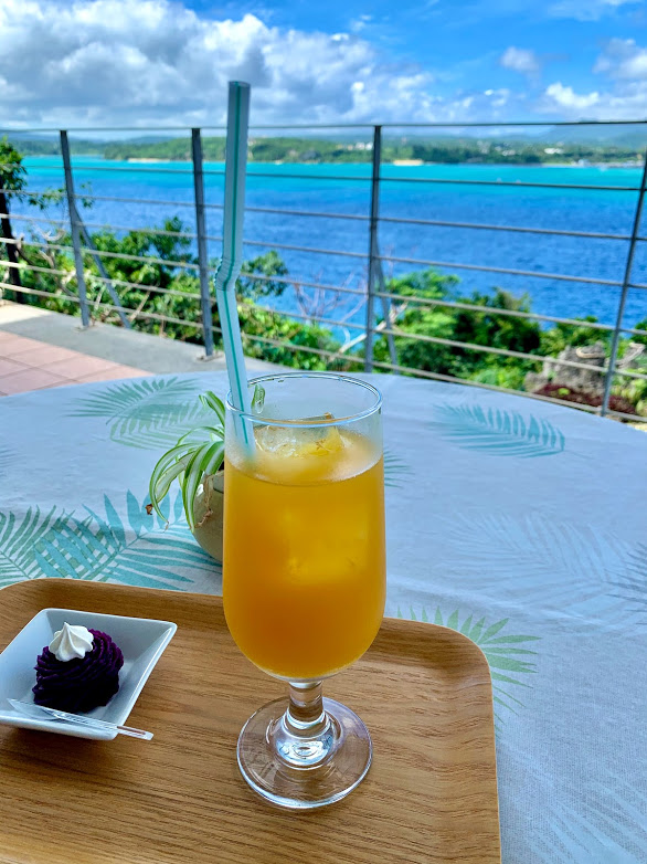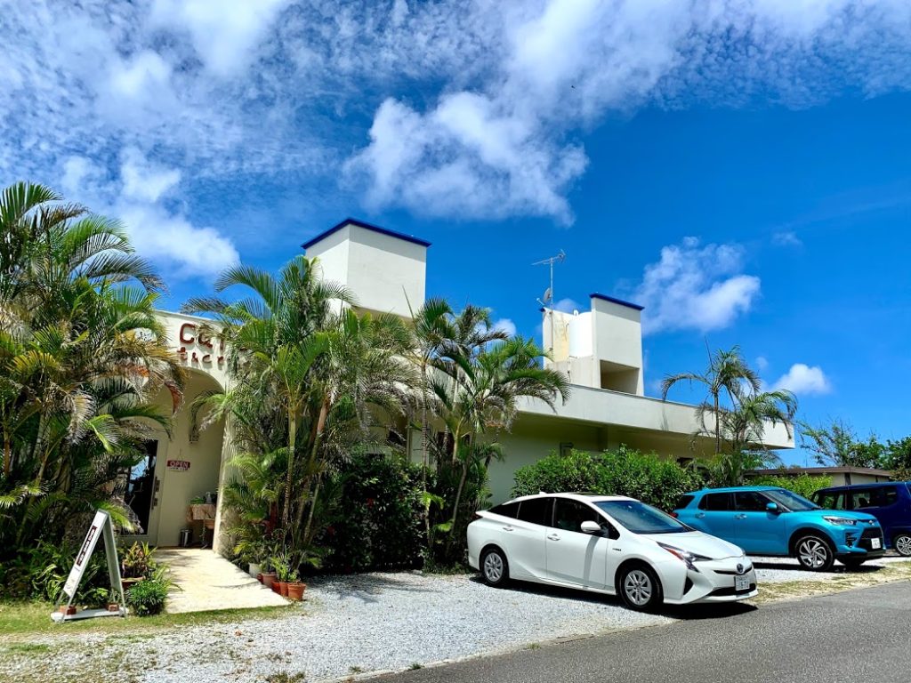 古宇利島、大橋を左回り、海岸沿いを走っていると、素敵なカフェがあるらしい。カフェt&c とうらく。あったあった。寄らせてもらおう。