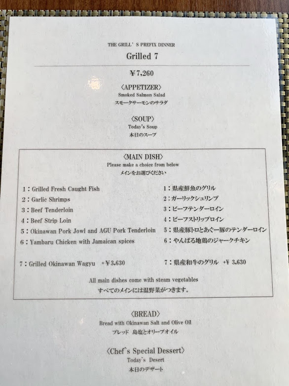 今宵の夕餉はホテルの中のレストラン、「ザ・グリル」にて、簡単なコース料理をいただくことに。新鮮な魚介類や地元産の食材を使ったシェフ自慢の特製料理というが、どうか。