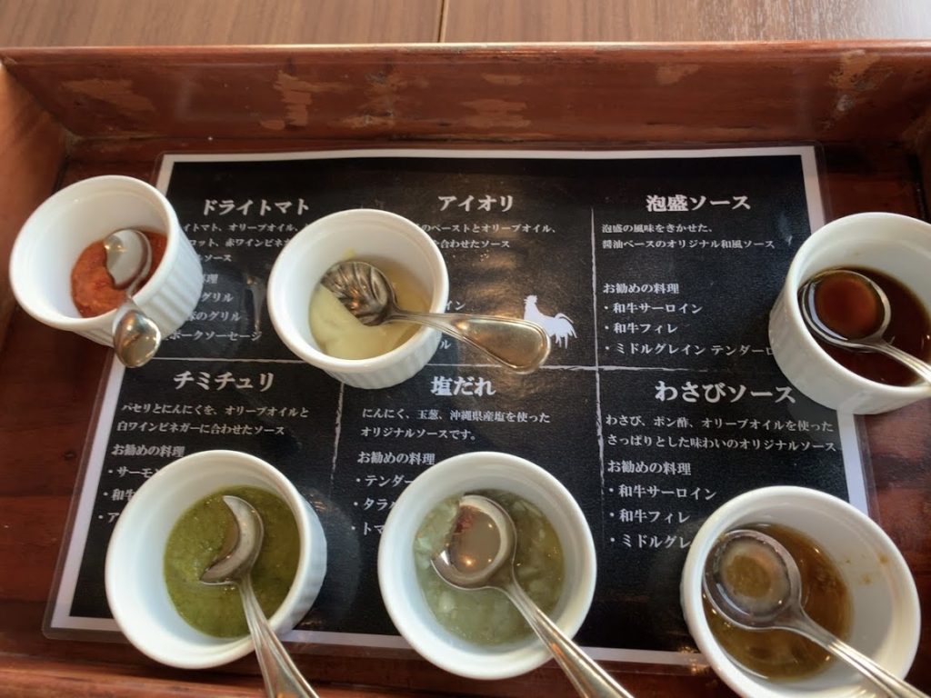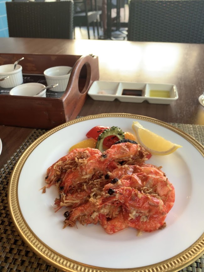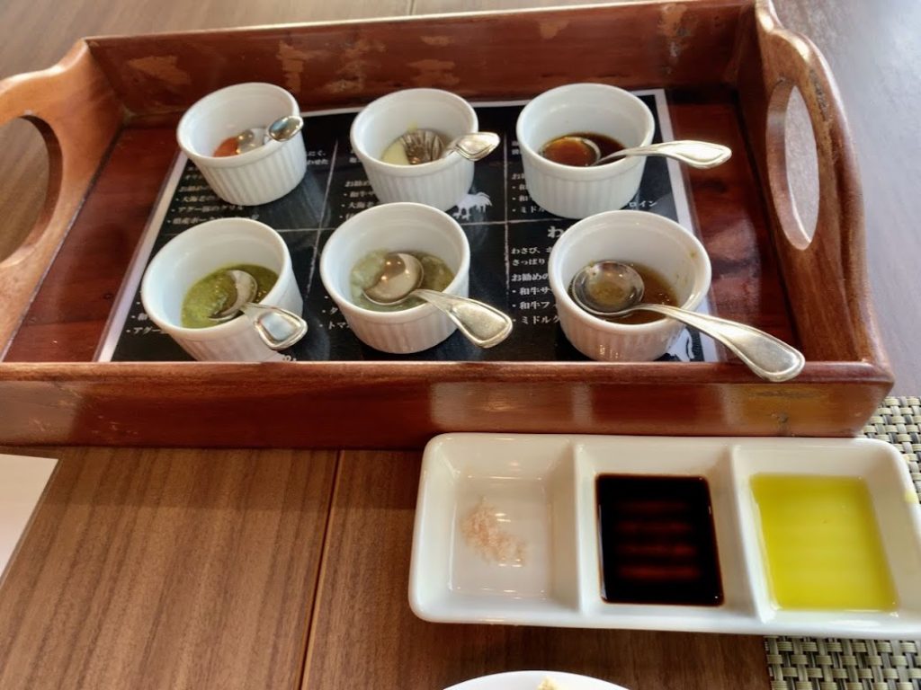 メインディッシュ。選択肢が7つあるが、ガーリック・シュリンプにした。ソフトシェルクラブのように、殻が柔らかいエビが写真の通り。海老にガーリック風味だからこれは美味いに決まっているが、これに加えて6種類のソースというか調味料というかタレというか、料理のアクセントになるものが用意された。加えて岩塩と醤油とオリーブオイルも用意されていたから、計9種類あったというわけだ。