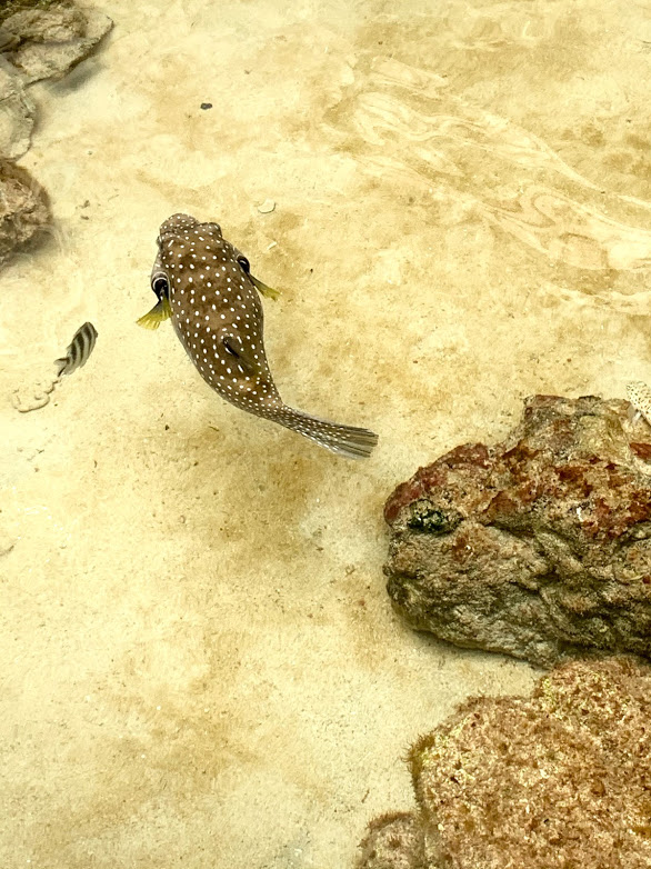 これはハリセンボン。ふぐ科の魚で、突っついたり怒らせたりすると、トゲトゲのふぐになる、あの魚。平常時のハリセンボンを上から見ると、こんな感じなんだな。