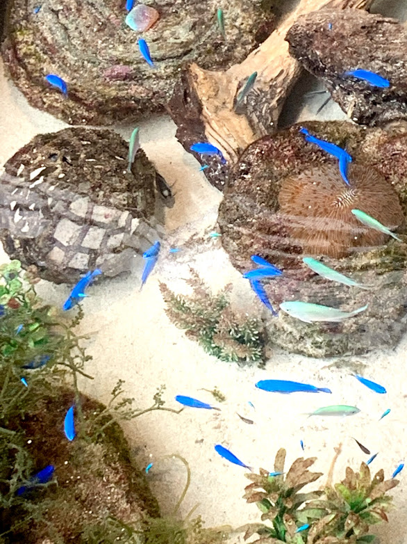 この青い魚は、シュノーケリングやダイビングをするとよく見られるやつだよな。沖縄の海で。きれいなもんだ。