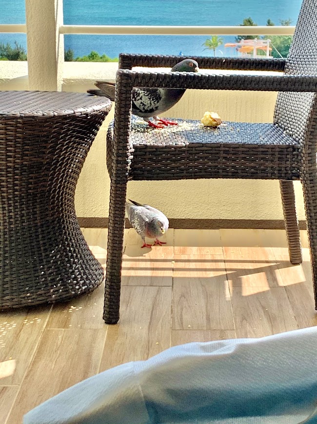 朝食ビュッフェをいただいて部屋に帰ってきたら。鳩が近くにいるみたいだ。部屋に置いてあったお菓子をバルコニーに置いてみたら、食べに来たよ!お菓子をついばんでいた。可愛いな・・・これは初めての経験。ホテルの部屋から海を見る。そこになついている鳩がいる。最高だ。幸せな気持ちになれるもんだな。これこそ、気分はリゾートだ。