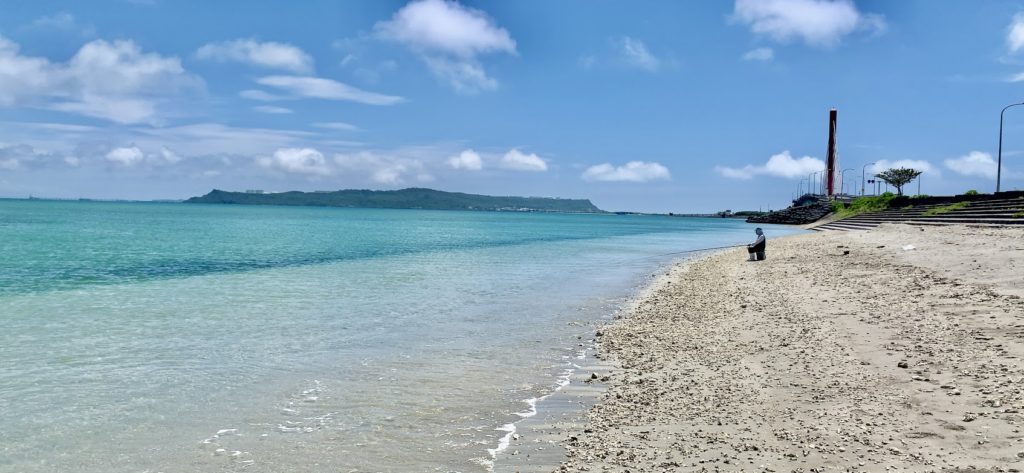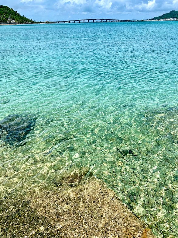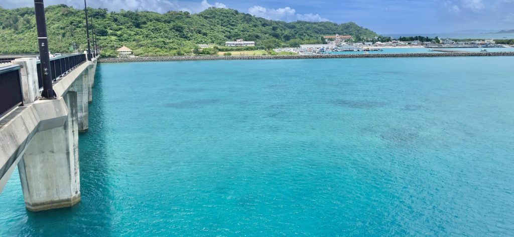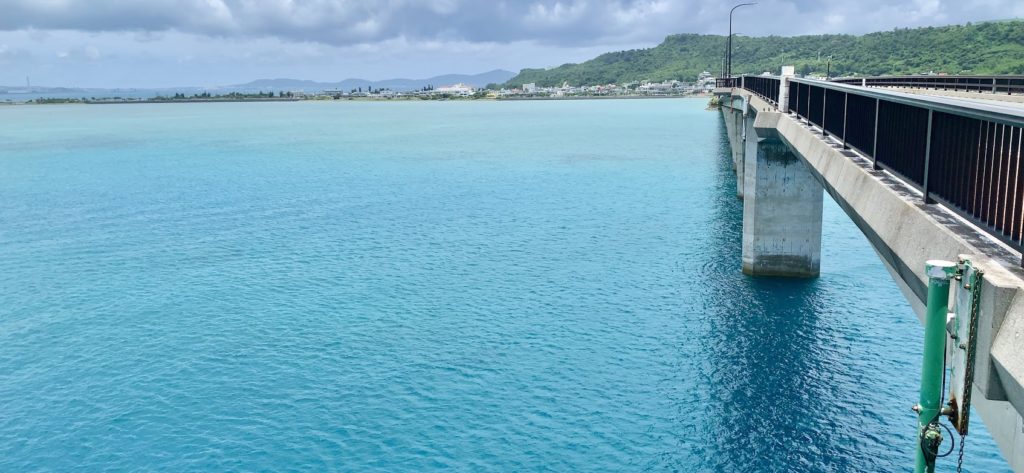 これは海中道路。きれいだよな。海水の透明度も高い。釣りをしてる人もいるな。何が釣れるのかな・・・