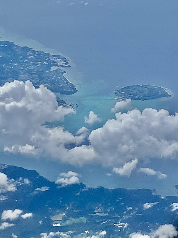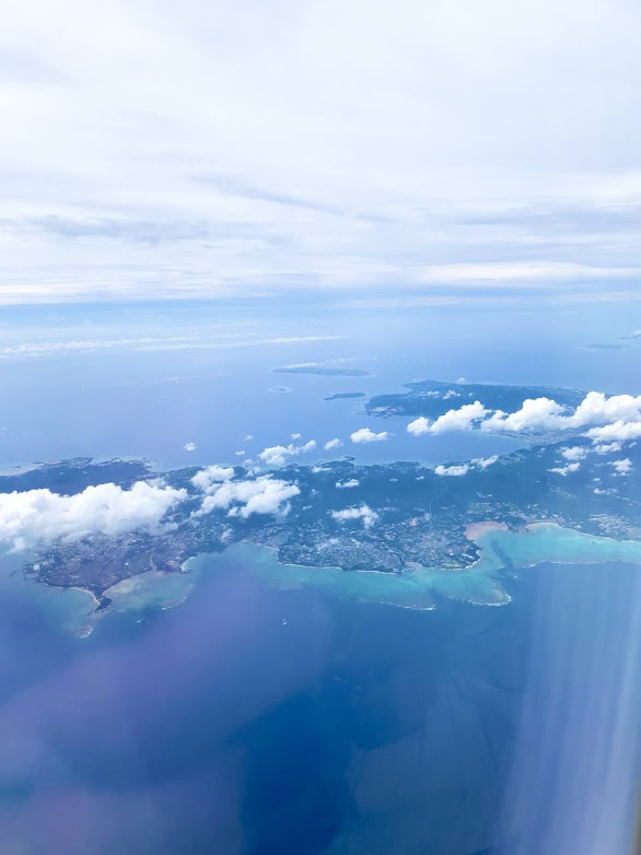 那覇から飛行機が飛び立つ。左の写真には海中道路、浜比嘉島がおぼろげに見える。空から見るとこんな感じなんだな。