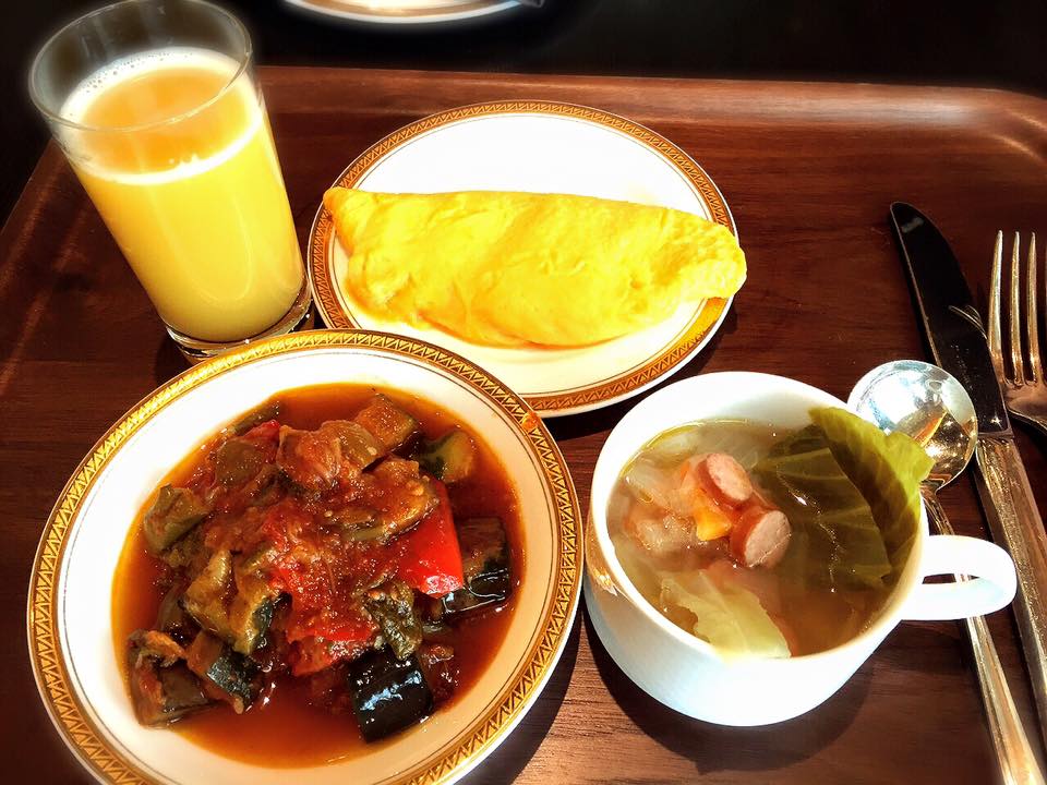 ホテルでビュフェの朝食を。まずはラタトゥイユ、野菜スープ、オムレツなどを。ここは野菜メニューが豊富。日ごろの野菜不足が一気に解消できるな。