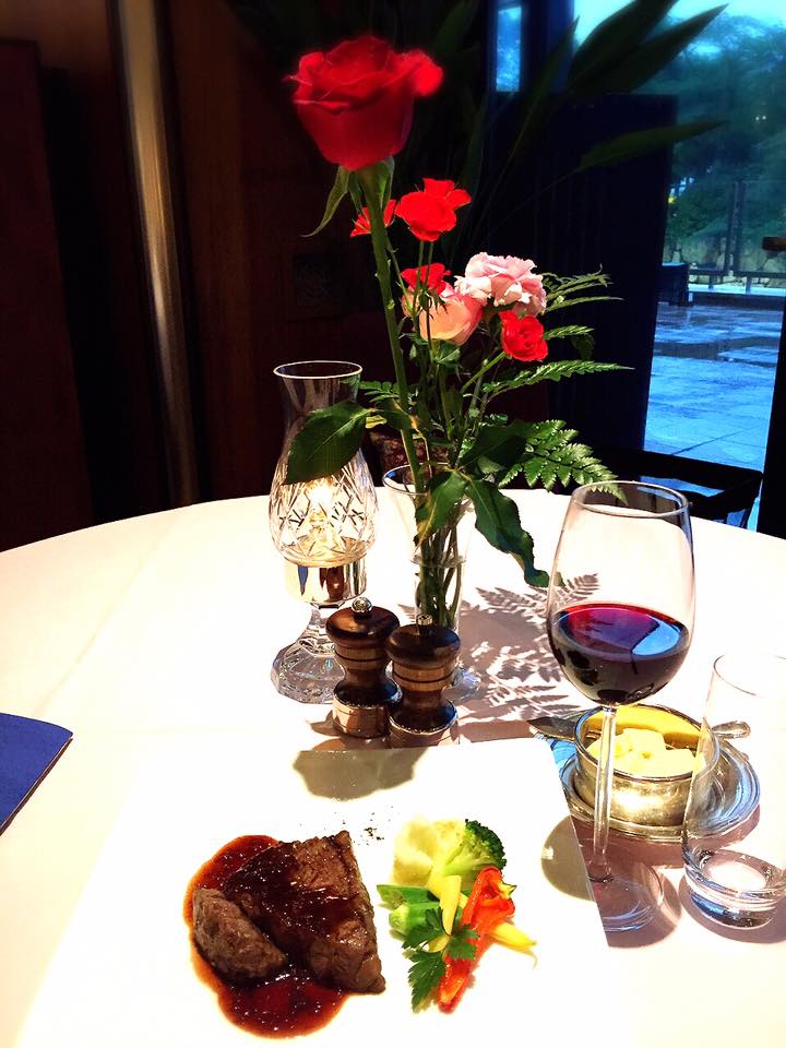 続いては、本日の季節野菜を使ったクリームスープ。そしてメインはこれ。岡山県産は牛もも肉のグリエ、赤ワインのソース、季節の野菜を添えて。
