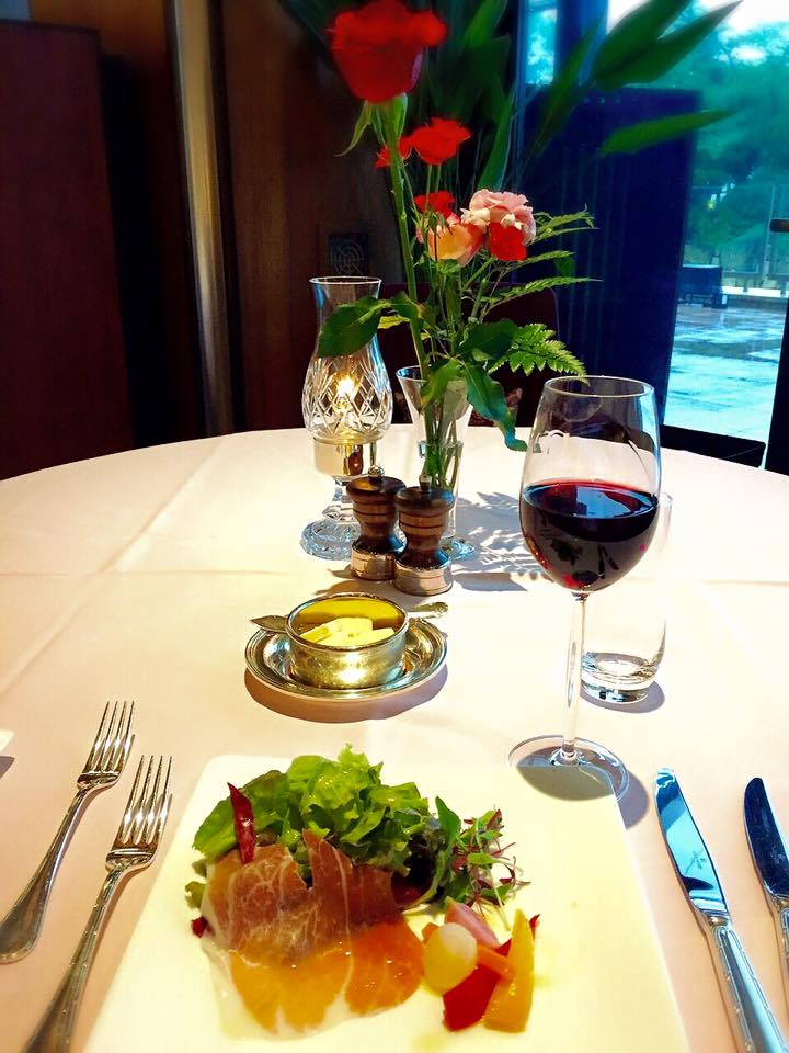 「天気が悪い日でも、建物の中で良い時間が過ごせる、楽しめるホテルです」との説明がどこかにあったが…実際その通りだろうなぁ。雨の日にはバーかラウンジで、フルーツをアテに、昼から白ワインでもいただく。そんな過ごし方も悪くなさそうと感じられた。夕餉。1人フレンチ。ここのホテルのは美味い。まずは前菜。地野菜のガルグイユとプロシュート 香草の香り。
