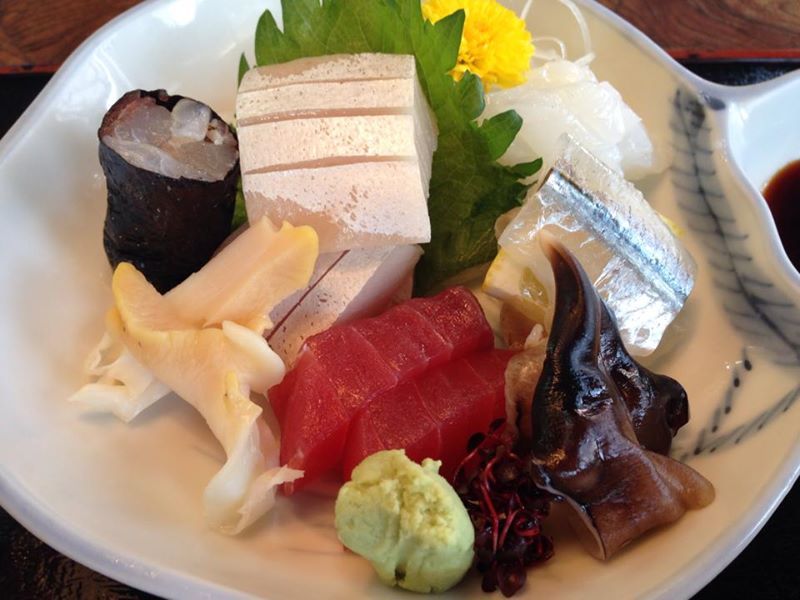 刺身定食1,000円也をいただく。ブリ、さより、マグロ、もんごうイカ、ばい貝、とり貝、白身魚の巻物、あと、すずきが下に隠れている・・・食材は、多くが日本海の地のものと。実に旨し。