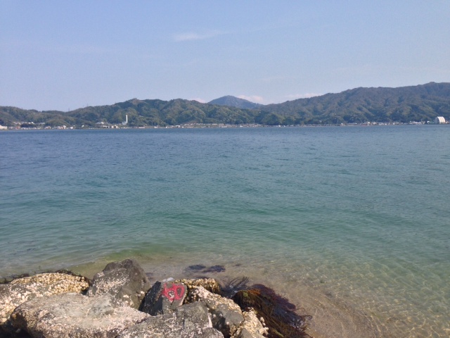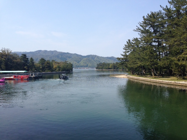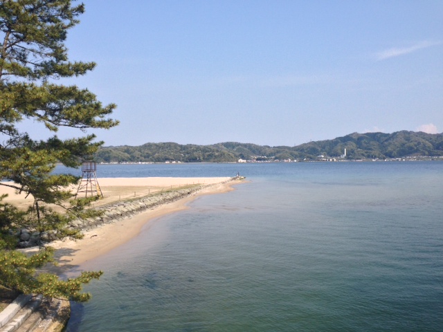 今度は実際に、天橋立を歩いてみる。最初とその次の写真を見てもらうとわかると思うが、天橋立の中の手前のところに、右に伸びた三角形の砂州がありますよね。ベージュ色の。この先端まで足を伸ばすことに。で、この写真はその途中にある、対橋からの眺め。西方向。きれいだよな。