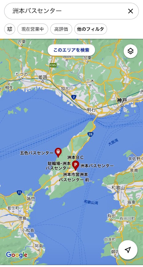 大阪から山陽本線の新快速で、神戸を経て舞子で下車。歩いて舞子公園へ。そこから神姫バスに乗り換え、淡路島の中心地のひとつ、洲本バスセンターに向かう。