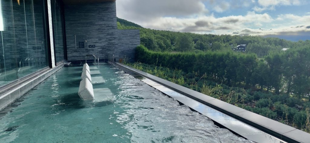朝餉の前の散歩、朝風呂で、昨日も来た「ルスツ温泉・・ことぶきの湯」に来てみる。晴れた日の朝風呂は最高だ。そしてこの露天温泉からの眺めも最高だ。