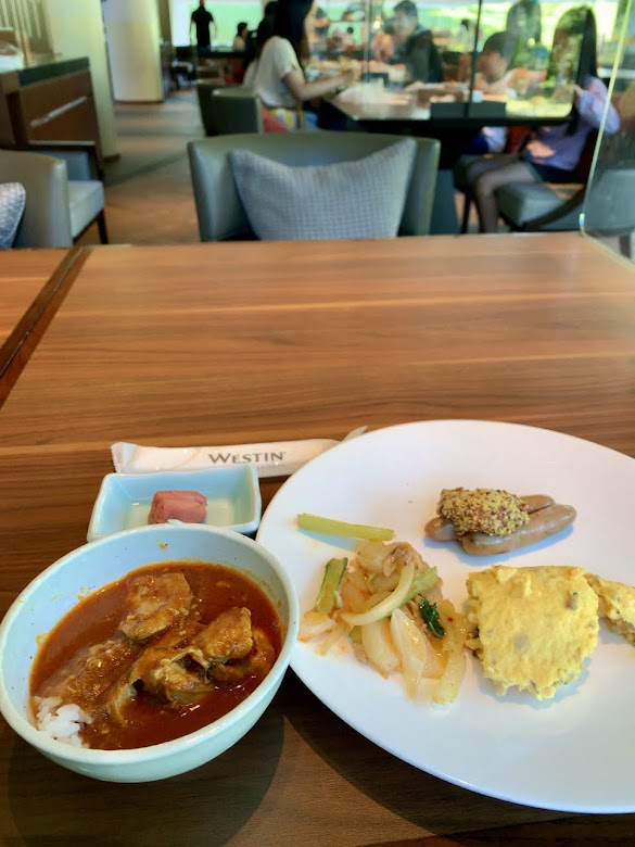 ビュフェ朝餉。いろいろなメニューがあり、それぞれにいただく。上の写真ではカニの鉄砲汁、下ではカレーが美味しだったな。もうお腹がいっぱいで、必然的にランチは抜き。満足だ…。
