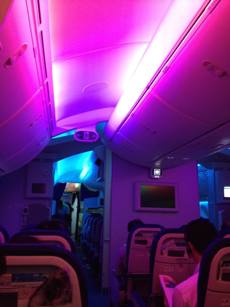 ボーイング787の機内。止まっているときは、こんなカラフルで幻想的な照明なんだな。