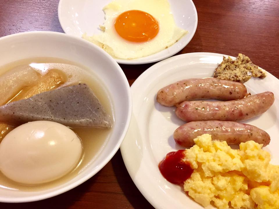 翌日、ビュフェの朝食。「フルフル」というレストランでいただくが、これが期待以上!旨かった。正直、どこかの地方の古めのシティホテルのそれを上回る。メニューも豊富!朝食ビュフェに、大きな鍋でおでんが鎮座ましまているというのも、珍しいよな。