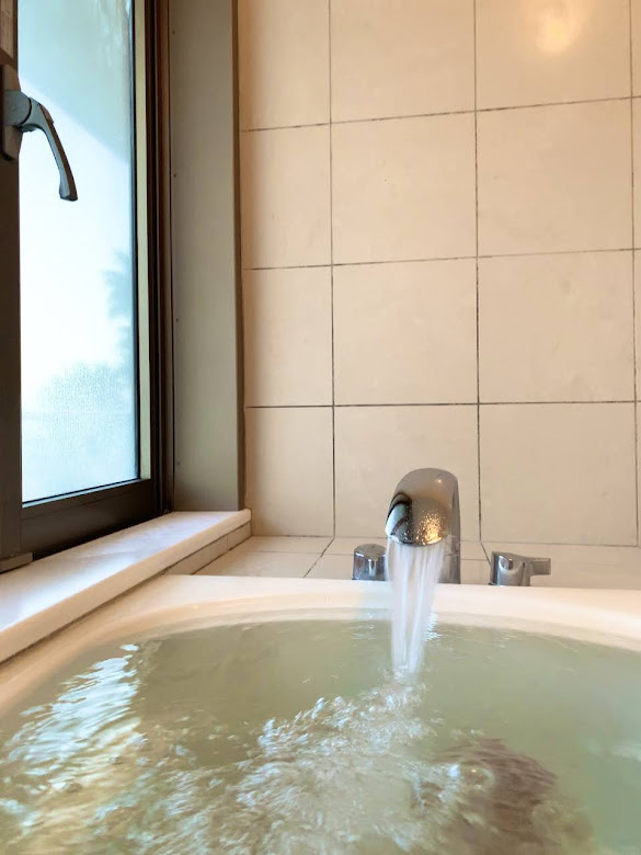 こうなる。お湯が入った方が全然いいよな・・・朝風呂は、部屋についている内風呂を。お湯を入れてみると、なかなかいい感じだ。お湯につかると、温まりながらTVの音声を大きくして、テレ東のニュースモーニングサテライトを聞くことができる。なんともいいいな。
