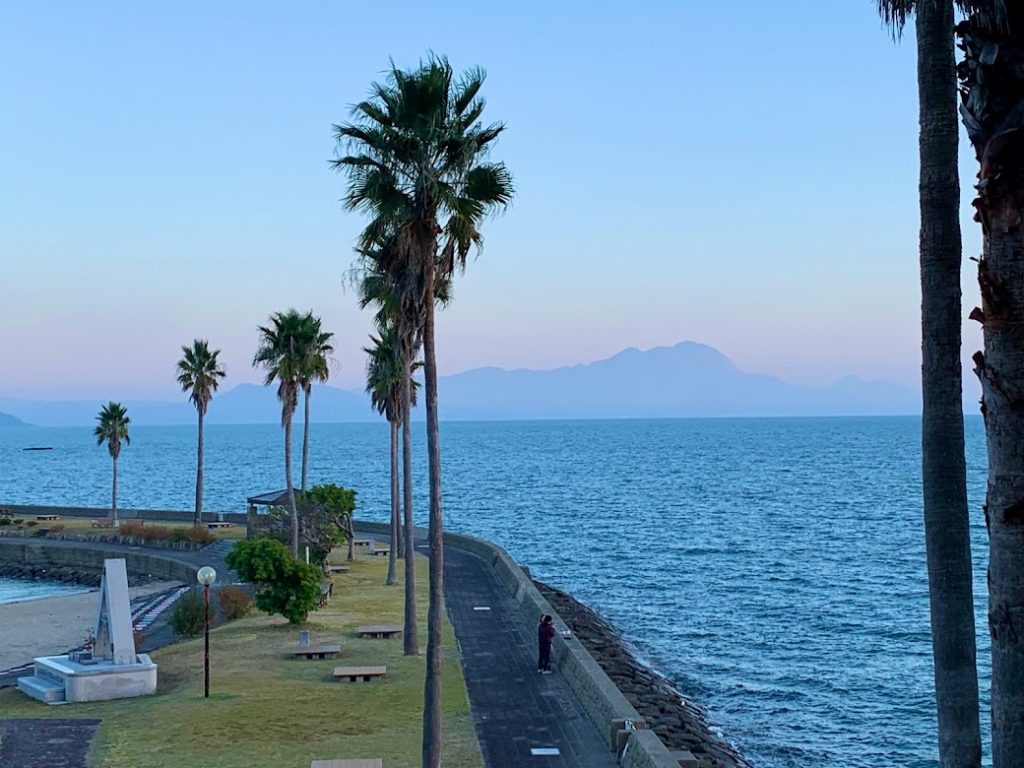 ホテルアレグリアガーデンズ天草の朝が来た。ほのかな朝焼け、トンビが高く飛ぶ。今日は良い天気になりそうだな。