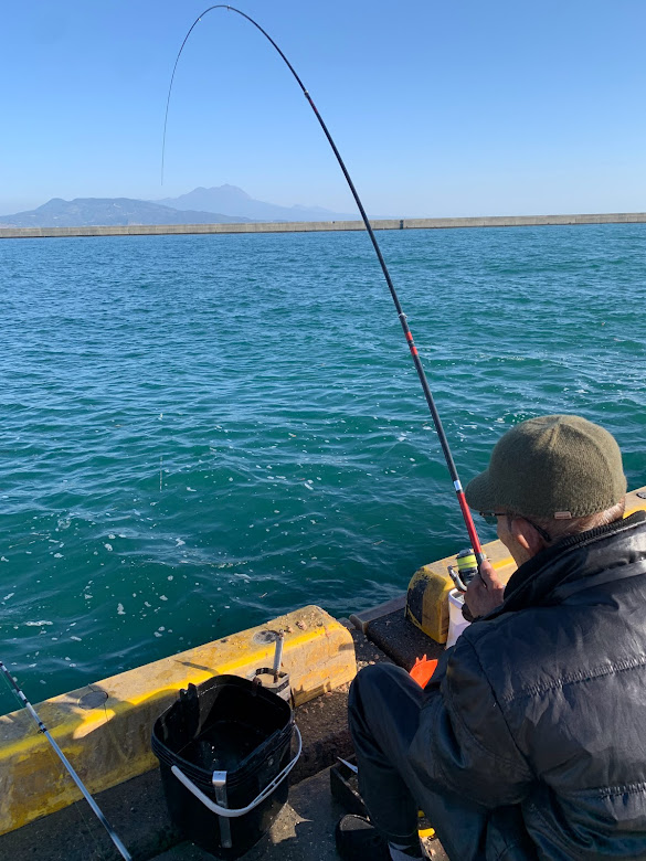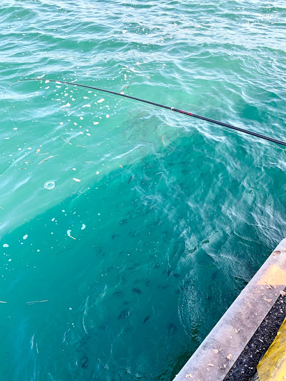 小さな魚がたくさん。これは「さびき」に寄ってきている小魚で、これを釣ろうとしているわけではないというが・・・水族館以外で魚がたくさんいるのを見るのが出来るの嬉しいな。海なし県出身の私としては。