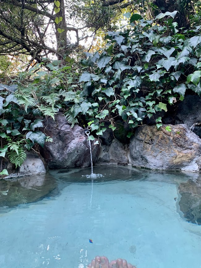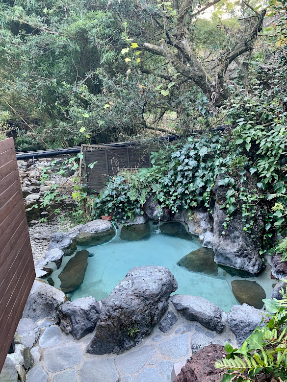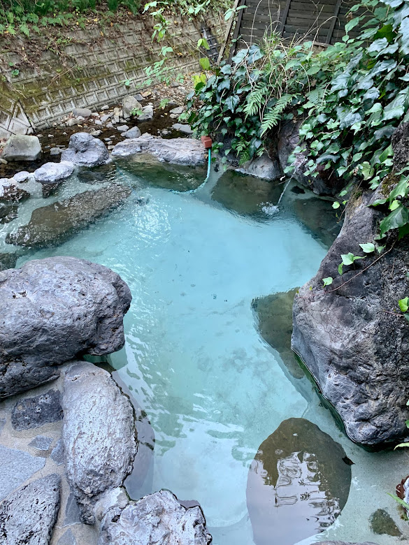 宿の貸切露天風呂へ。最高だ!確かに、とろりとした硫黄泉、源泉かけ流し。泉質は湯に浸ると肌がヌルヌル、チュルチュルしてくる感じで、入っていても出てからも、とても気持ち良かった。少しぬるめなので、ゆっくり入っていられる。