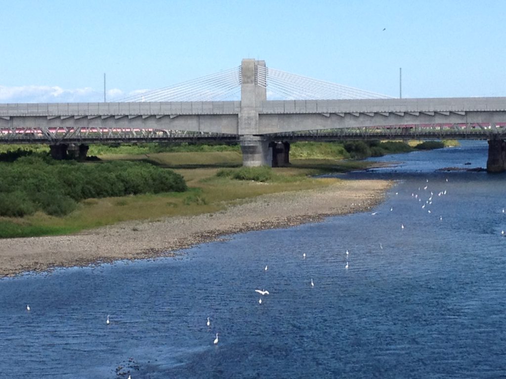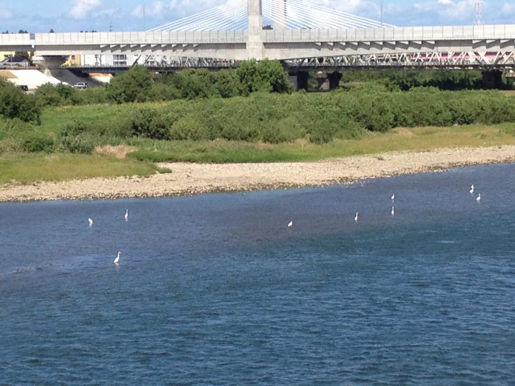 白く見える鳥は、鷺(サギ)の群れ!鷺がこんなにたくさん、川にいるの、生まれて初めて見た。しかも、県庁所在地近くの川に…これはとても、感動ものだったな。