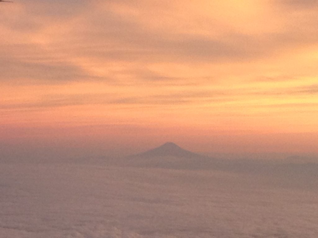 飛行機、羽田に近づいてくると、夕焼けの中、雲の向こうに、富士山が。富士山、この見え方するの、富山もしくは小松発の羽田行きだけだよな。